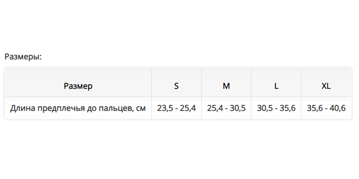 Длина предплечья до пальцев, см 23,5 - 25,4 25,4 - 30,5 30,5 - 35,6 35,6 - 40,6
