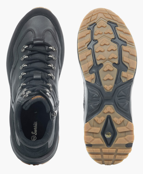 Верх из гладкой черной натуральной кожи в сочетании с вставками из нубука, текстильный манжет в области голеностопа - все детали создают актуальный продуманный образ. Застежка на молнии с внутренней стороны в дополнение к шнуровке значительно повышает удобство надевания. Текстильная подкладка обеспечивает комфортное тепло в прохладную погоду. Анатомическая стелька с выраженной поддержкой сводов способствует распределению нагрузки на ноги и снижению усталости при ходьбе. Голеностоп надежно удерживается от завала плотным задником. Модель очень легкая благодаря подошве из вспененного материала ЭВА,который еще и отлично амортизирует. а противоскользящий протектор обеспечивает устойчивость даже на скользких поверхностях. Подошва имеет перекатный профиль, что особенно полезно для людей, много времени проводящих на ногах. Такая подошва формирует физиологически правильную походку и снижает усталость.