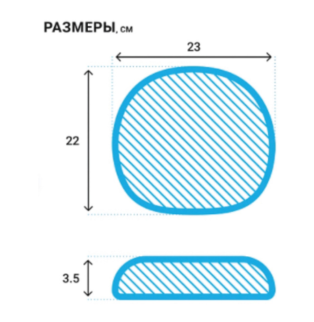 Размер 23х22х3,5 см. Подушка  изготовлена с учётом анатомических и физиологических особенностей тела ребенка: она фиксирует голову и шейный отдел позвоночника в анатомически правильном положении. Этому способствует углубление в конструкции подушки под затылком и мягкий валик под шейным отделом.
