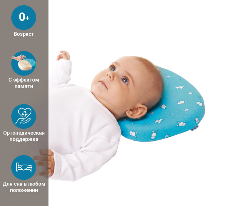 Подушка  изготовлена с учётом анатомических и физиологических особенностей тела ребенка: она фиксирует голову и шейный отдел позвоночника в анатомически правильном положении. Этому способствует углубление в конструкции подушки под затылком и мягкий валик под шейным отделом.
