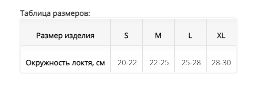 | Окружность локтя, см | 20-22 | 22-25 | 25-28 | 28-30 |