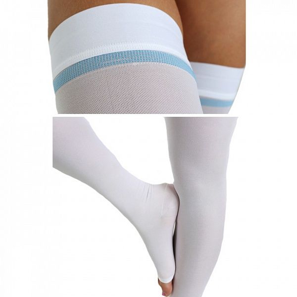 - Надежная фиксация чулок на бедре за счет широкой силиконовой резинки;
