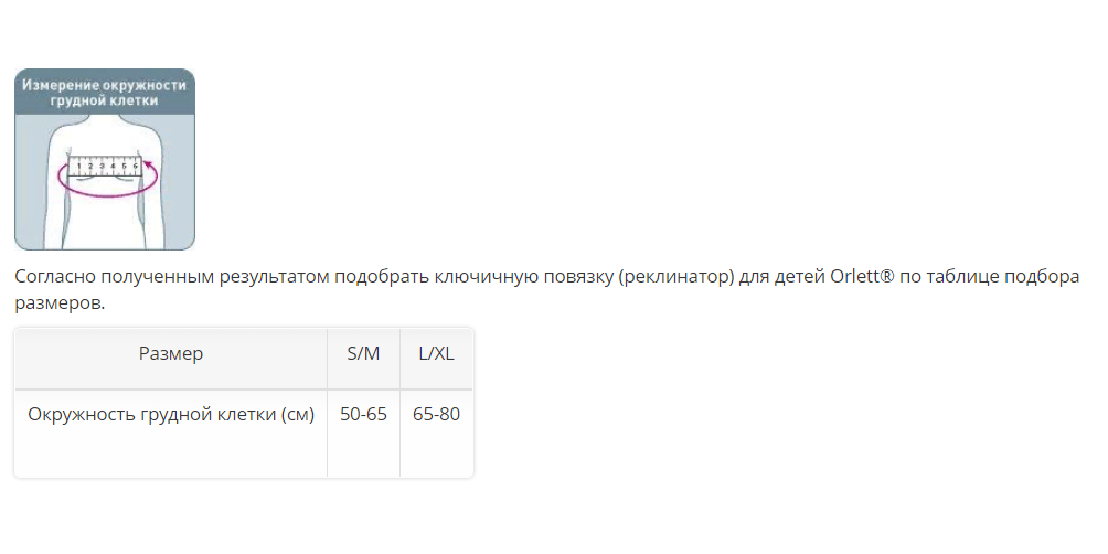 Согласно полученным результатом подобрать ключичную повязку (реклинатор) для детей Orlett® по таблице подбора размеров.