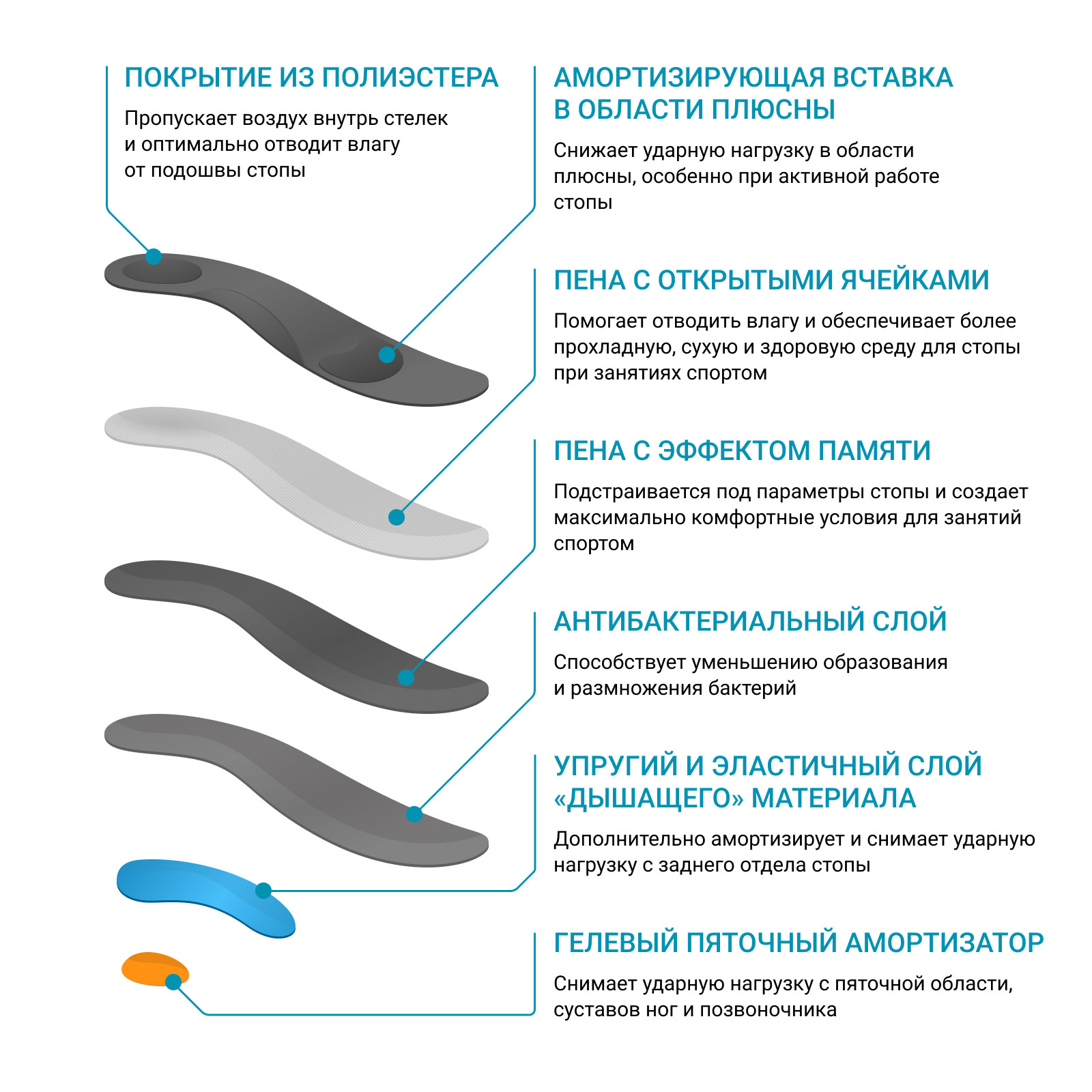 - Микропористый полимерный слой обеспечивает максимальную амортизацию всей стопы при повышенных нагрузках;