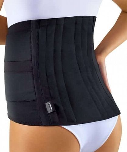 Спинка изделия выполнена из нерастяжимого хлопчатобумажного полотна, корсет имеет широкий эластичный пояс и дополнительные боковые стяжки, усилен 4-мя моделируемыми ребрами жесткости.