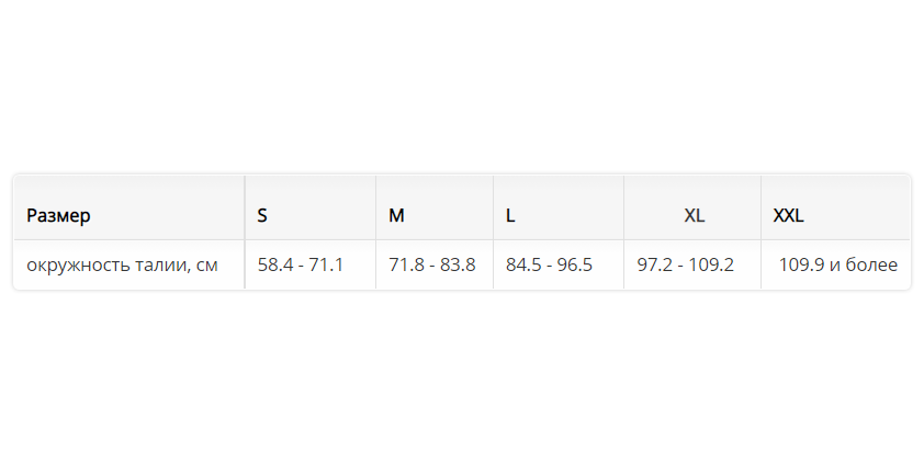 | окружность талии, см | 58.4 - 71.1 | 71.8 - 83.8 | 84.5 - 96.5 | 97.2 - 109.2 | 109.9 и более |