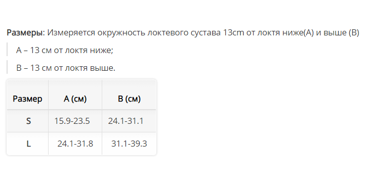 Размеры: Измеряется окружность локтевого сустава 13cm от локтя ниже(A) и выше (B)