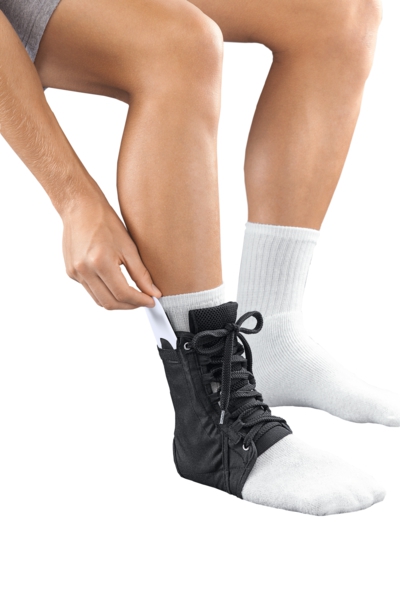 Принципиальное отличие protect. Ankle lace up от других ортезов данного типа заключается в том, что в нем применяется шнуровка, которая позволяет регулировать степень стабилизации голеностопного сустава в широком диапазоне. Эта особенность очень важна для тех пациентов, которые не могут надеть обычное компрессионное изделие из-за сильной боли в области травмы.