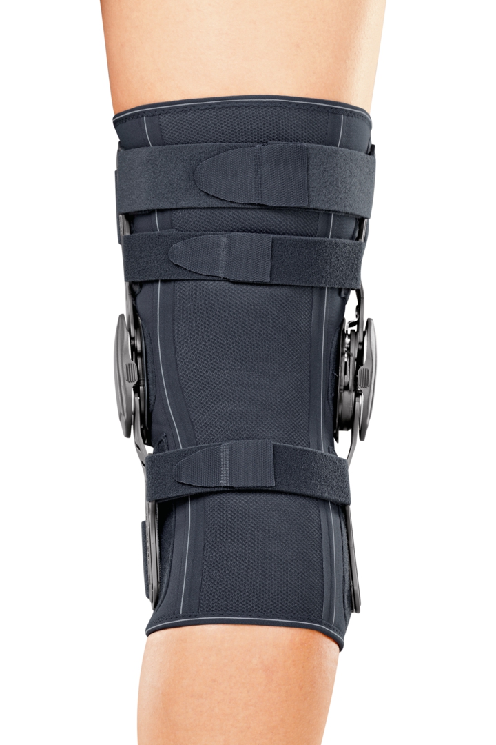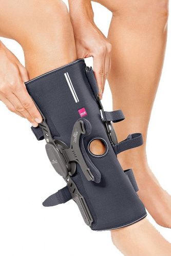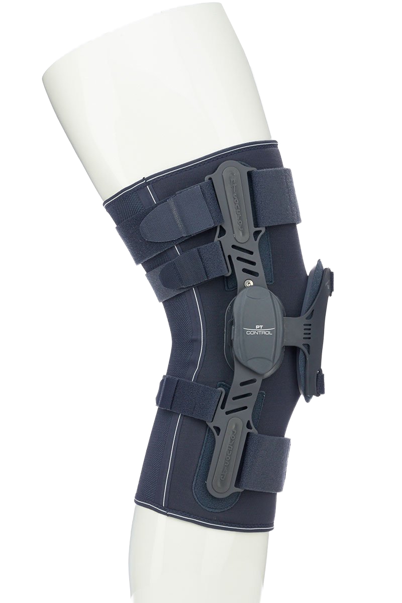 После ряда операций и травм может понадобиться ограничение движения коленного сустава и дополнительная стабилизация коленной чашечки (надколенника). Специально для таких случаев был создан ортез medi PT control. Боковые ребра жесткости эффективно стабилизируют коленный сустав, а специальная телескопическая C-образная не позволяет смещаться надколеннику наружу ни в положении стоя, ни при сгибании коленного сустава. В ортезе используется специальный полицентрический шарнир physioglide, который копирует физиологическую биомеханику коленного сустава. Это очень важно, так как при сгибании коленного сустава C-образная накладка должна смещаться точно на ту величину, на которую смещается надколенник. С помощью специальных вставок в шарнир можно иммобилизировать или ограничить движения в коленном суставе в соответствии с индивидуальным планом лечения. Амплитуда сгибания и разгибания может быть задана в пределах от 0° до 30° с шагом 10°, а от 45° до 120° с шагом 15°. В дополнение к стабилизации компрессионная манжета улучшает кровообращение и питание тканей, что уменьшает отек и связанный с ним болевой синдром.