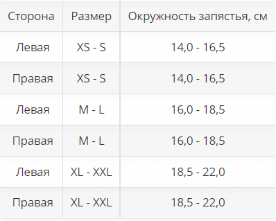 | Сторона | Размер | Окружность запястья, см |