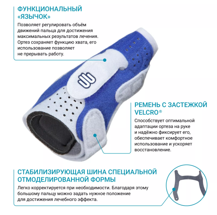 Ортез прекрасно подходит для стабилизации при травмах большого пальца (разрывы или растяжения связок), а также при признаках артрита или других повреждениях.