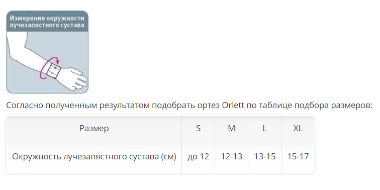Для корректного подбора ортеза Orlett на лучезапястный сустав необходимо измерить сантиметровой лентой (плотно, но не утягивая) окружность лучезапястного сустава.