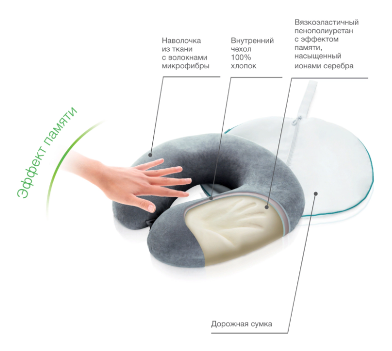 - Эффект памяти позволяет подушке адаптироваться к индивидуальной форме головы и шеи;