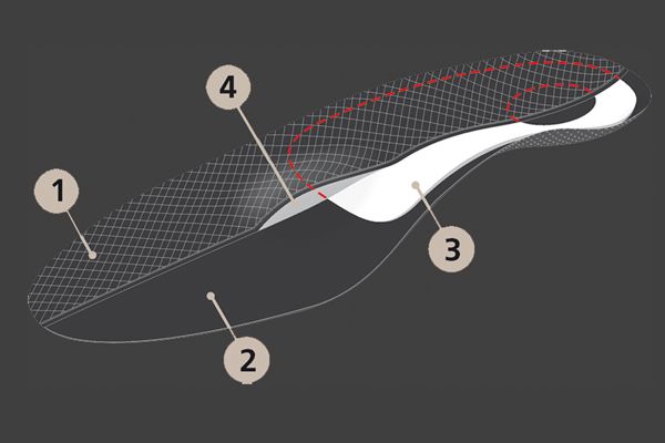 - Тонкий жесткий каркас эффективно поддерживает своды стопы и практически не уменьшает внутренний объем обуви.