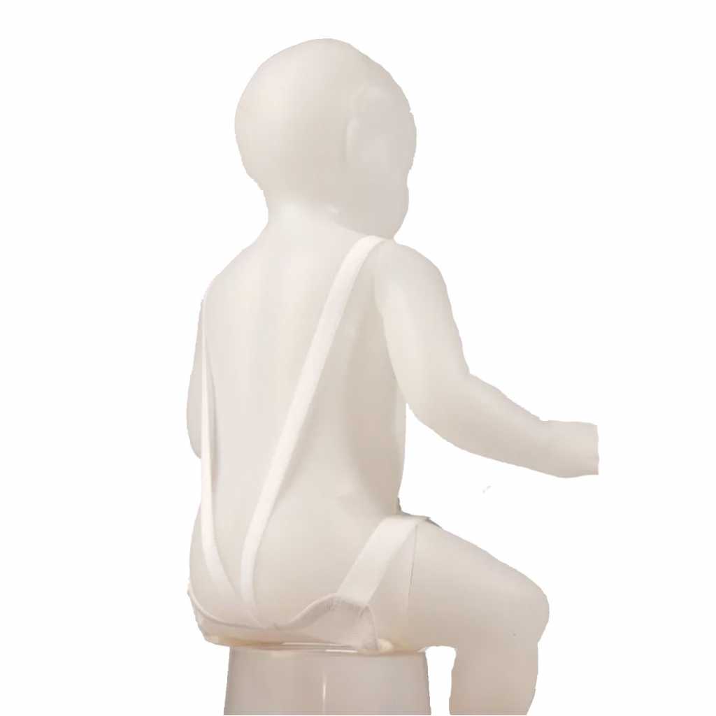 Изделие изготовлено из сетчатого материала, который делает изделие легким, не препятствует вентиляции и влагообмену. Шесть ребер жесткости обеспечивают изделию упругость и сохранение формы при эксплуатации. Фиксируется на теле изделие с помощью специальных застежек «велкро». Изделие используется только по рекомендации врача. Лямки обеспечивают более надежную фиксацию бандажа на теле ребенка.