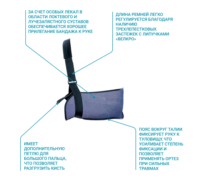 - дополнительный пояс вокруг талии позволяет фиксировать руку к туловищу, что усиливает степень фиксации и даёт возможность применять ортез при сильных травмах.
