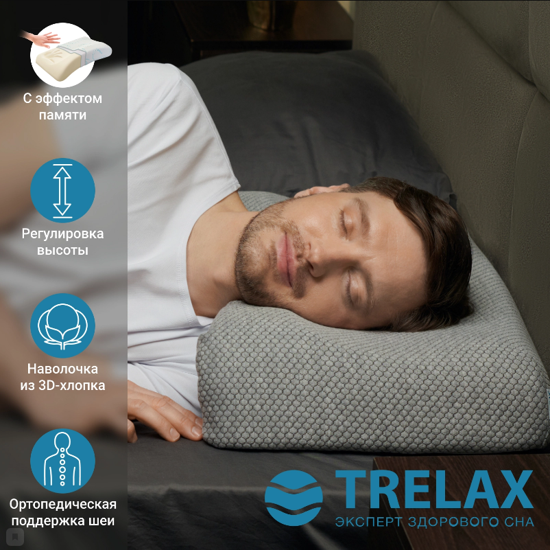 Подушка для сна на боку ортопедическая SOLA for man П30 Серая с эффектом памяти, Трелакс 60х38