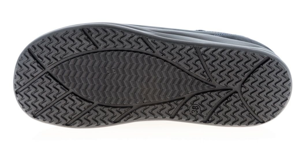 - Нескользящая подошва из полиуретана цельнолитого типа обеспечена небольшим подъемом в области пятки.