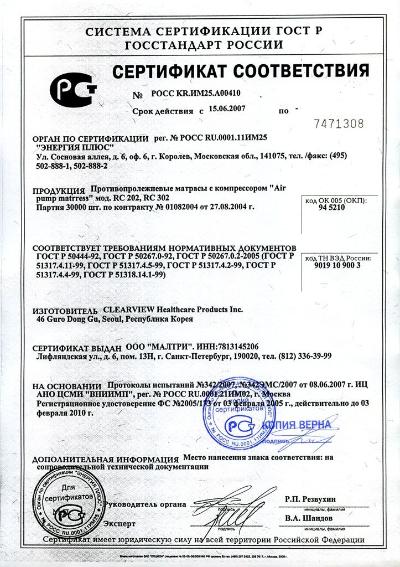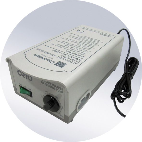 Воздушно-контрольный компрессор с креплением для спинки кровати создает необходимое давление в балонах матраса, снабжен регулятором уровня давления в зависимости от веса больного, бесшумен, безопасен, не токсичен.